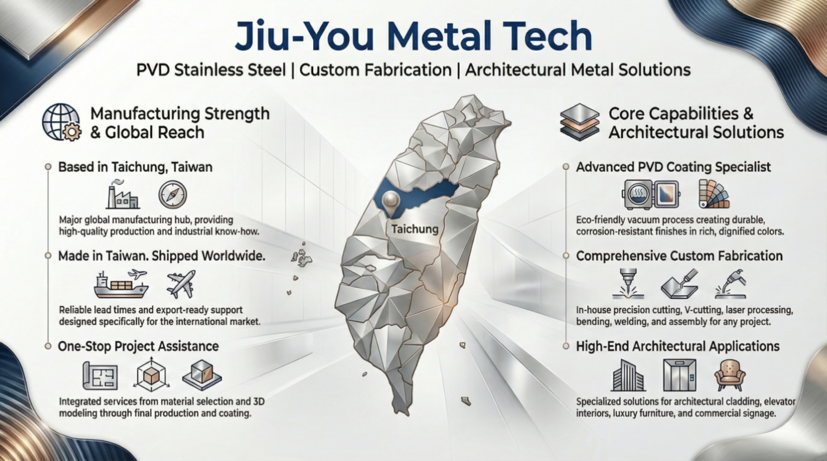Since 1997, Jiu-You Metal Tech has supported architectural, decorative, and commercial metal projects for customers worldwide. Based in Taichung, Taiwan, the heart of Taiwan's manufacturing sector, we benefit from the region's deep industrial ecosystem and strong supply chain network. Our focus is to provide dependable service and trusted support at every stage of the project, helping customers move their metal projects forward with confidence.