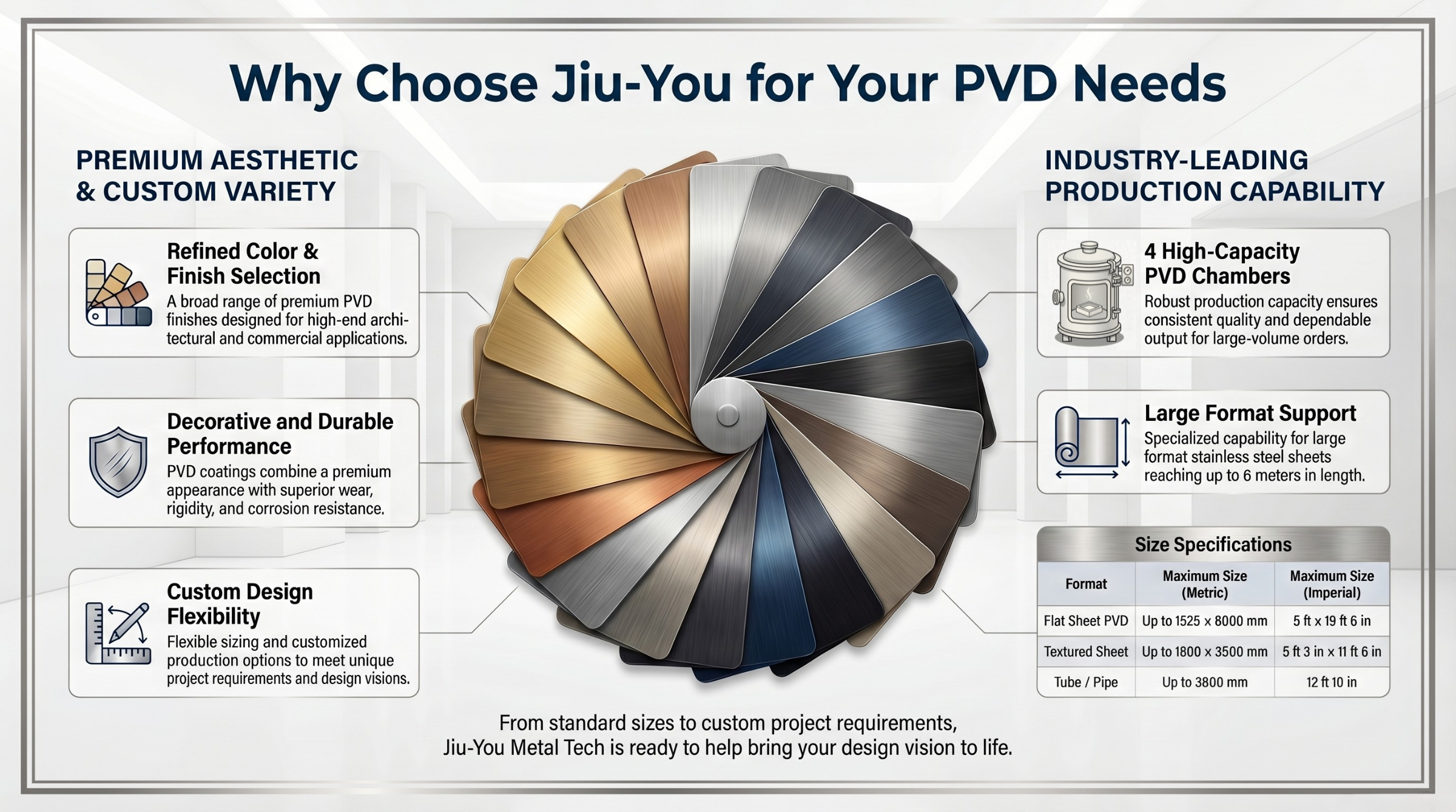 Jiu-You Metal Tech offers the flexibility, finish selection, and production support customers need for today's architectural and commercial metal projects. With wide color and texture choices, large sheet sizes up to 6 meters, advanced PVD systems, and full metalworking capabilities, we are ready to support a broad range of metal project needs with dependable quality. If you are looking for a partner that can provide refined finishes, responsive support, and the ability to handle a variety of project needs, Jiu-You is ready to help.