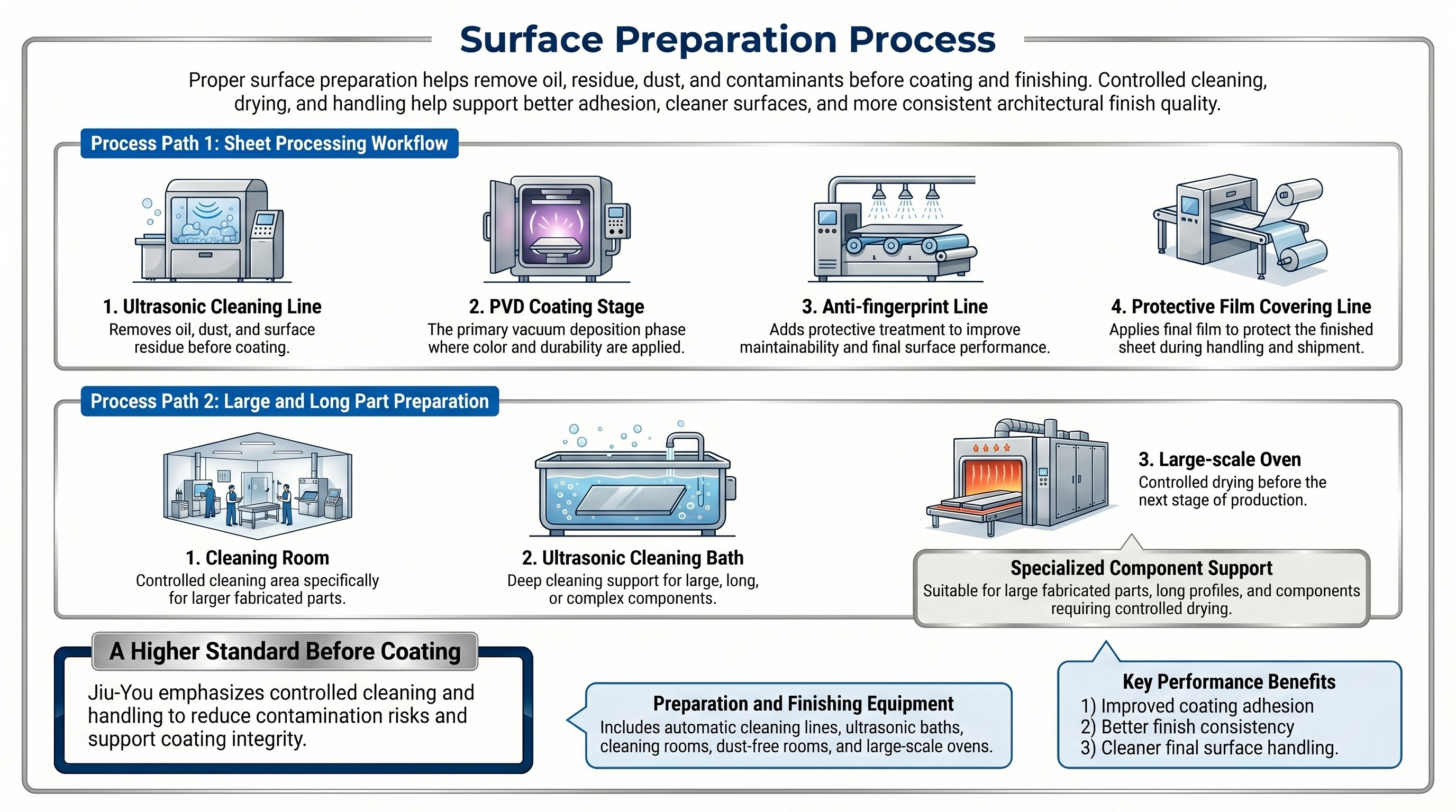 Our surface preparation capabilities include an automatic cleaning line, ultrasonic cleaning equipment, dedicated cleaning rooms, and a dust-free room for controlled handling. We also use large-scale drying equipment to help ensure surfaces are properly prepared before moving to the next stage of production. Together, these systems help support the coating integrity and finish consistency required for high-quality architectural and decorative metal applications.