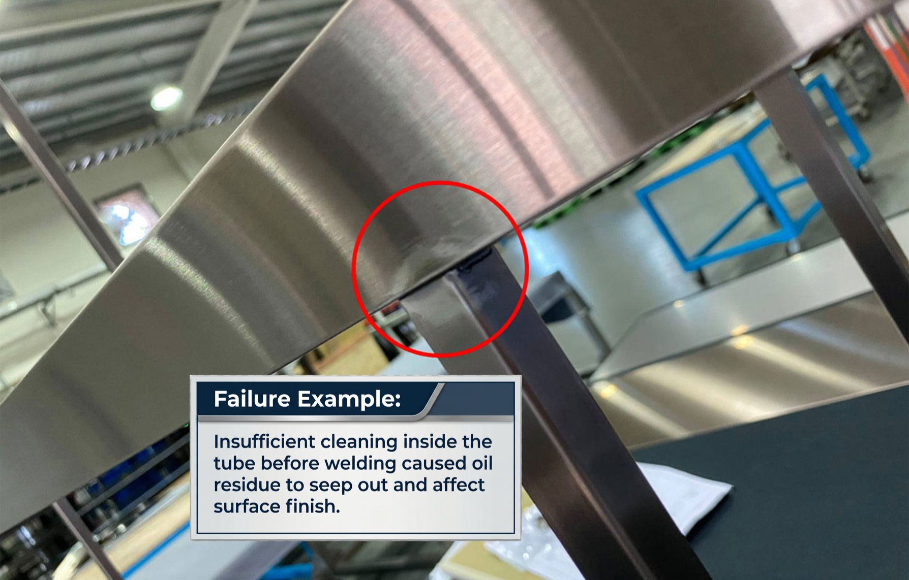 The picture below shows a surface defect caused by insufficient cleaning before welding. Residual oil or other contaminants inside the tube were able to seep out during processing and affect the final surface finish. This example highlights why proper cleaning and surface preparation are critical to coating quality and finish consistency.